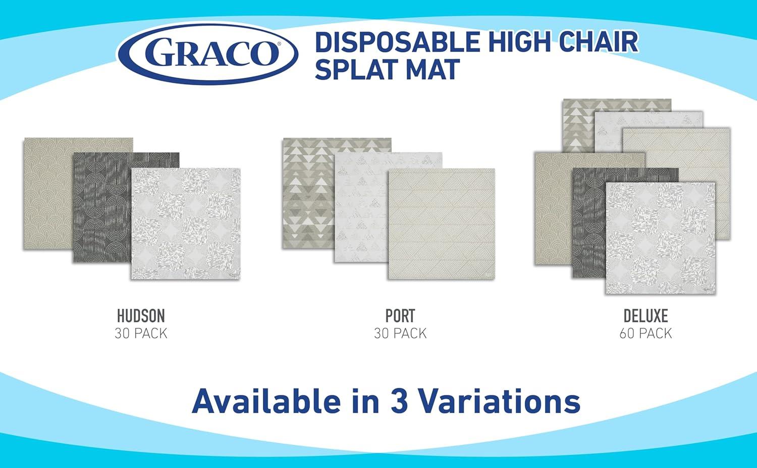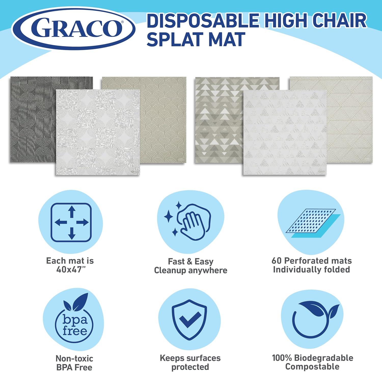 Graco Baby Disposable Splat Mats – 60 Count (6 Designs, 10 of Each), 47″ x 40″, Biodegradable Floor Protector for Mealtime, Under High Chair, Home & Restaurant Use(Deluxe 60 Pack)